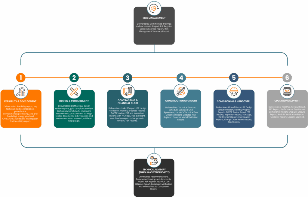 An OE mitigates these risks by validating irradiation and yield studies, reviewing site and design choices, and ensuring grid, environmental, and permitting checks are robust. At this stage, they also provide realistic CAPEX/OPEX assessments and deliver a clear risk register, giving owners a reliable foundation for decision-making.