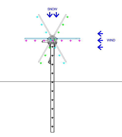 On the other hand, single-axis trackers rotate the panels around the torque tube. Every specific angle within the rotational angle has different dynamic behavior due to the changes in wind and snow forces that the structural designer must take into consideration. The figure below, shows different load paths (each arrow with a different color). These complex forces do not exist in a fixed-tilt structure.
